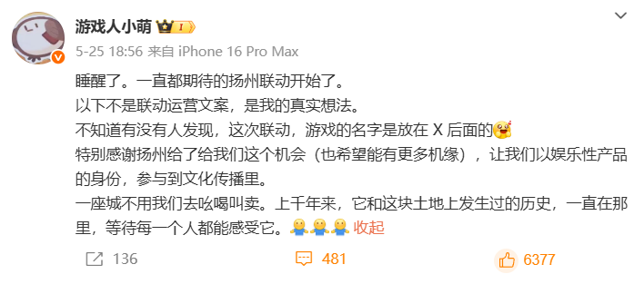 “其实特别感谢扬州给我们这个机会做这次联动。”小萌说,“最早的时候也是玩家玩了我们游戏以后自发去扬州打卡,也因此促成了我们的合作契机。”