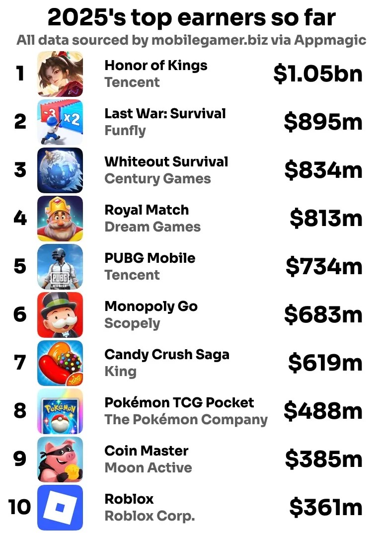 近日,外媒Mobilegamer.biz发布了2025年上半年的全球手游收入排行榜。(注:数据来源AppMagic,统计范围不包括第三方安卓渠道、网页商店及广告收入,且已扣除平台分成)