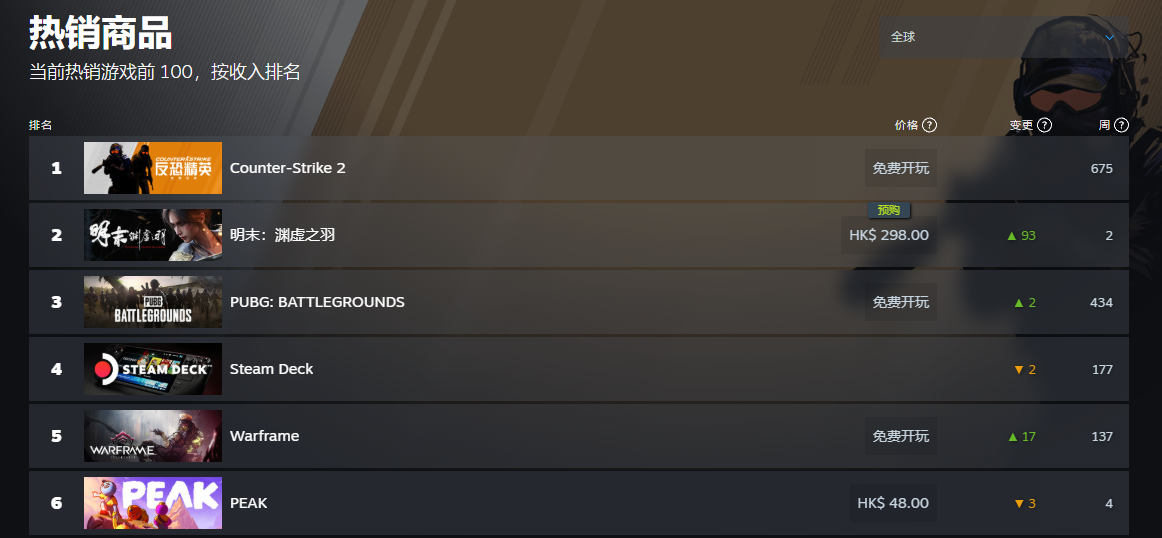 从游戏正式开启预购至今,《明末》已连续12周保持在国区steam热销榜中,期间还多次登上榜首;不仅是国内,在全球steam热销榜单中也表现强劲,游戏在发售的前一周上升了93名,截至发稿排在全球榜第2的位置,仅次于免费游戏《CS2》。