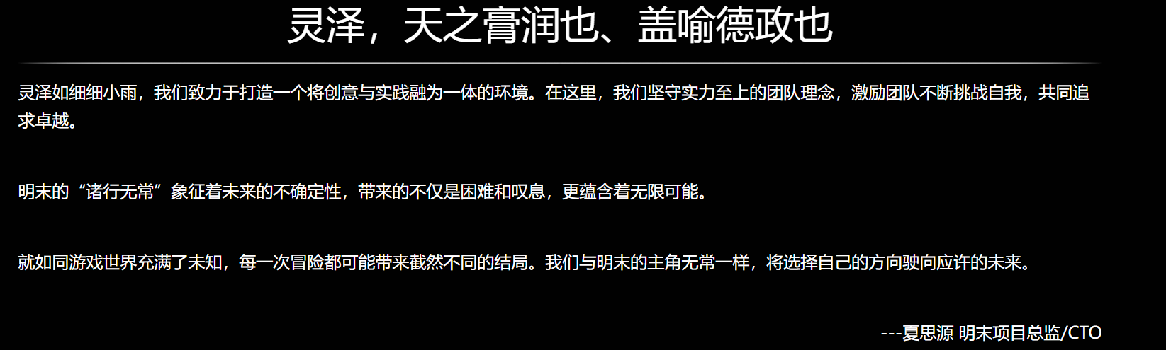 游戏团队在首支实机演示的简介中这样写道:“我们是一家低调务实且兼备技术实力的游戏公司,我们之前有5年的技术积累才让我们有足够的信心去把更多人投入这款游戏上,而且我们毫不怀疑我们产品落地的能力。”