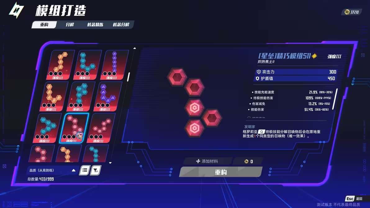 最后,在局外养成系统方面,《矩阵》也没有采用肉鸽游戏常见的技能树设计,而是引入了拼图形式的“模组”系统。模组通过游戏结算获得,玩家可根据自己的构思组合不同模组,放入卡槽提供属性加成。高品质模组还会带有随机特殊词条,改变某些机制玩法。