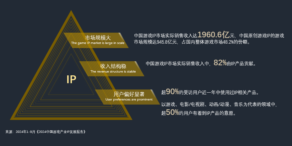 陈超在演讲中指出,2025年游戏行业正迎来政策赋能、用户共鸣与行业托底的三重机遇。随着市场从“增量竞争”转向“存量博弈”,IP已不再是简单的流量入口,而是构建差异化竞争壁垒、实现品牌价值永续增长的核心资产。根据《2024中国游戏产业IP发展报告》数据显示,2024年1-9月,中国游戏IP市场销售收入达1960.6亿元,其中原创IP占比48.2%,超90%的用户有跨领域消费IP的意愿。这一数据充分表明,IP在游戏产业中的重要性日益凸显,印证了IP生态化运营已成为行业突围的必由之路。