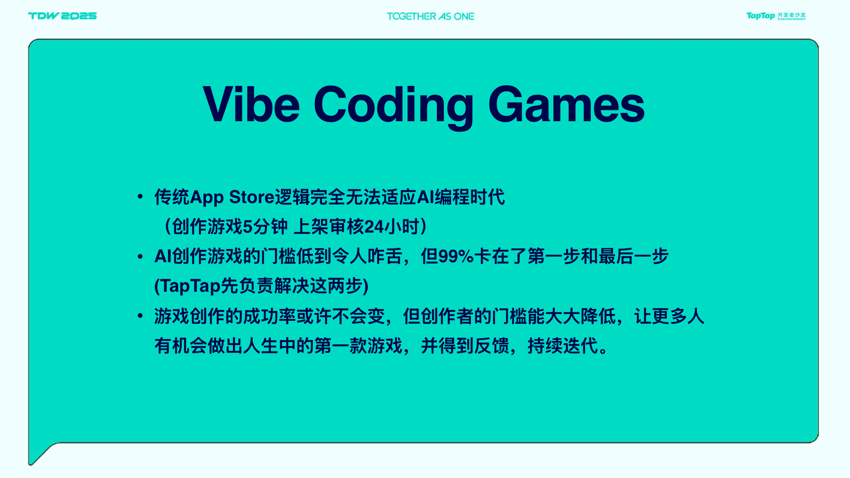 他认为,AI 编程已将游戏创作的门槛降至令人咋舌的低点,但复杂的开发环境配置与传统应用商店漫长的分发流程,成为了阻碍创意的最大瓶颈。TapTap 将通过大力发展小游戏平台等方式,将「创意产生-游戏上线-算法分发-玩家反馈」的整个流程极致提速,拥抱 vibe coding 时代,让更多有创意的内容创作者,有机会做出自己的第一款游戏。