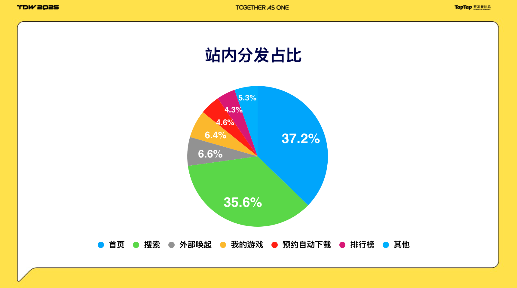 广告分发只占我们流量的一小部分,即便首页 20% 的曝光占比看起来不低,但首页推荐在 TapTap 全站所有分发中的占比也并非那么高。因为从站内整体的流量结构来看,首页推荐的流量仅占不到 40%,而高达 35% 的用户通过「搜索」来寻找游戏。我们为此感到自豪,因为这代表了大量玩家已将 TapTap 视为官方、可靠的游戏下载渠道。当他们知道一款游戏后,会主动打开 TapTap 进行搜索和下载。
