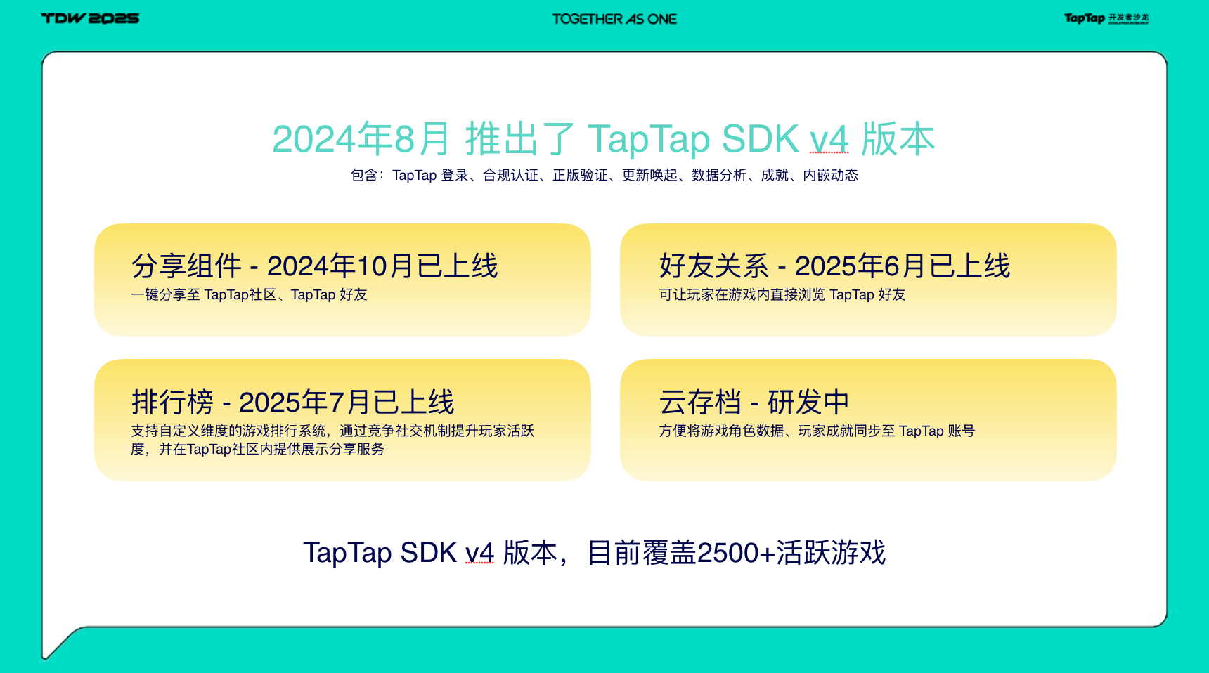 接下来谈谈 TapTap 的 SDK. 我们清醒地认识到,过去 TapTap SDK 的历次版本更新,因兼容性和规划问题给开发者带来了许多困扰。在去年的开发者沙龙上,我们承诺将放低预期,对标 Steam SDK,回归并完善基础功能。经过一年的努力,我们相信 TapTap SDK V4 版本将为开发者提供更稳定、有效的基础功能支持,包括即将上线的云存档功能,它能为许多单机游戏提供接近联网游戏的存档体验。