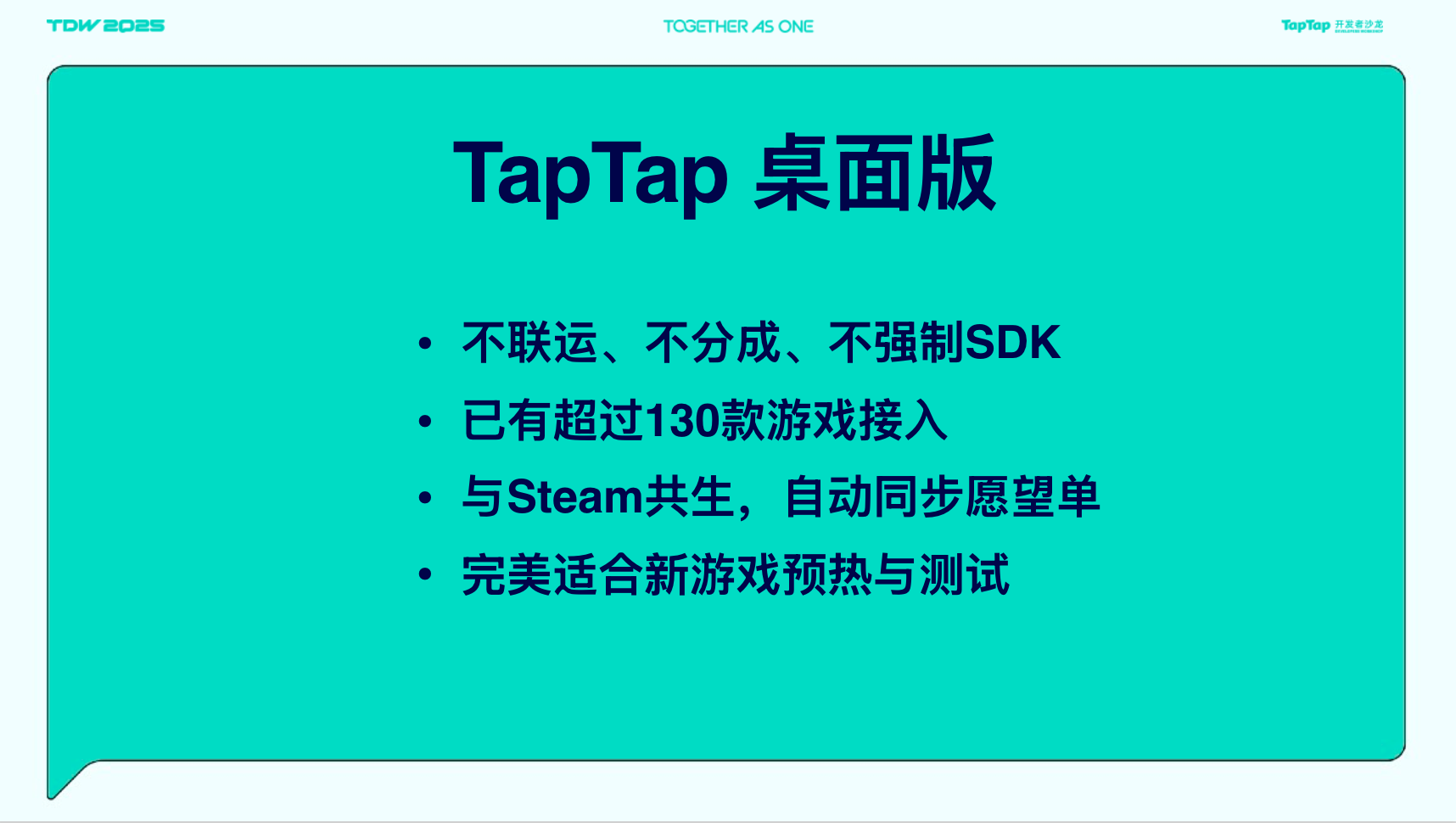 TapTap 桌面版致力于为玩家提供完善、流畅的下载、安装、管理体验。它将继承手机版的特点:不联运、不分成、不强制接入 SDK。开发者只需提供绿色包,即可轻松上架。目前,TapTap 桌面版已具有一定规模的用户。这个体量对于一款新游戏的预热和测试,已能提供充足的支持。我们鼓励开发者重视 PC 平台,不要放弃这个重要的增量市场。同时,我们也愿意与 Steam 生态共存,即便游戏最终在 Steam 发售,TapTap 也愿意在宣发、预约、测试等环节提供帮助。
