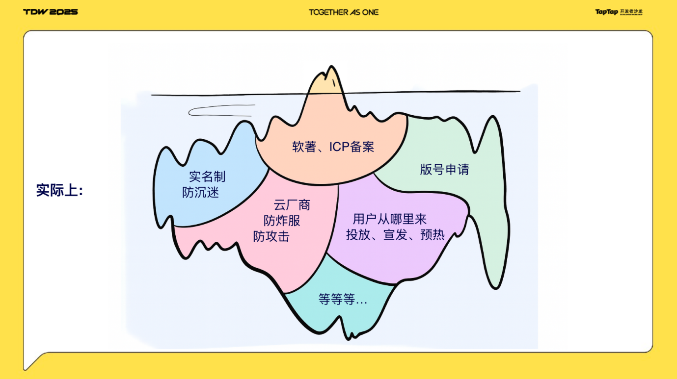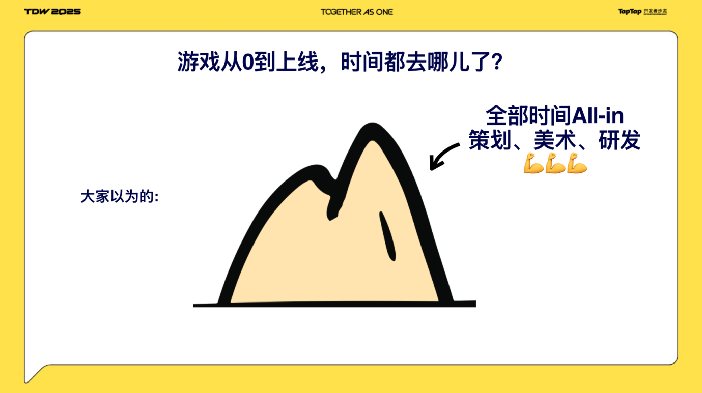 我前两天在网上看到了一个梗图,是说一个游戏从零到上线,时间都去哪儿了,大家梦想做一个游戏的时候,全部时间 All-in 策划、美术、研发。其实冰山下还有无数的深坑,有无数的问题要解决、克服,并不能只专注于游戏研发本身,而不得去做很多自己不擅长,也不感兴趣的领域。这就是我们为什么要去做小游戏,为什么要去做 SDK,为什么做商业化的尝试,所有都是围绕这个点,希望将来有一天大家在 Tap 上做游戏,尽量少考虑其他东西,只考虑我想做一个怎样好玩的游戏,只要这个游戏做出来了,玩家玩到了,就能够有正向的反馈,就能够去做更好的产品,这是我们的愿景。