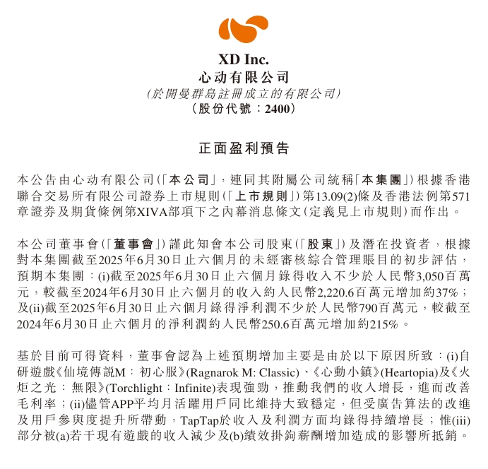 昨天(8月4日),心动公司(02400.HK)发布了2025半年度盈利预喜公告,预期2025年上半年取得收入不少于人民币30.5亿元,较去年同期收入(22.2亿元人民币)增长约37%;净利润不少于人民币7.9亿元,同比增长约215%。