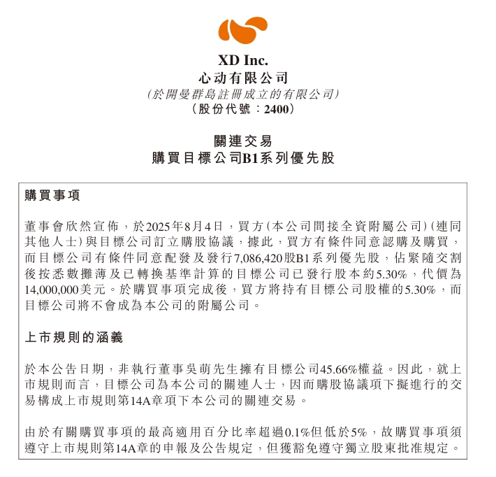 对外发布盈喜预告同时,心动昨天还另外释出了一则公告,表示旗下子公司将以1400万美元(约合人民币1亿)的作价收购游戏公司MiAO 5.3%的股份。按此比例反推,MiAO的整体估值将达到2.64亿美元(约19亿元人民币)。