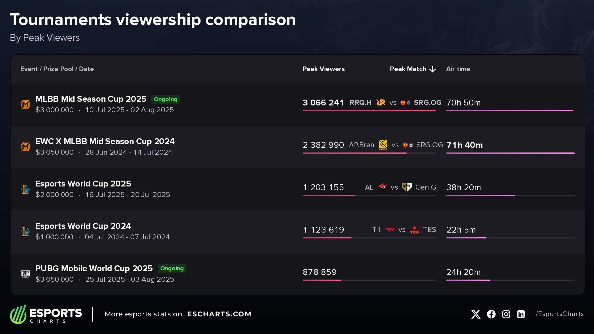 Esports Charts联合创始人兼首席执行官Artyom Odintsov评价:“本届MSC为全球电竞赛事树立新标杆,峰值观众人数突破300万,跻身全球年度热门电竞赛事TOP3。”