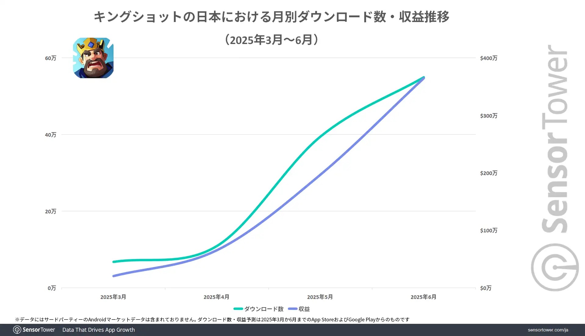 Sensor Tower数据显示,2025年3月至6月期间,《Kingshot》在日本的下载量及收入趋势为:其3月下载量超过6.5万次,收入超过20万美元;而到了6月,下载量达到55万次,收入超过350万美元,各项指标均实现了10倍以上的增长。
