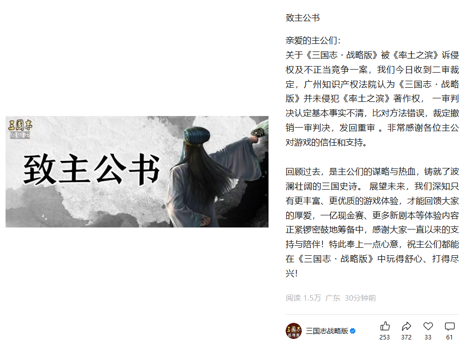 相信不少朋友最近两天的朋友圈、游戏群都在被「《三国志·战略版》被《率土之滨》诉侵权及不正当竞争一案」的二审判决刷屏。
