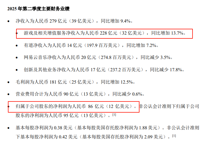 而今天(8月14日),随着Q2季度财报的发布,网易又交出了一份新的成绩单:净收入为279亿元,同比增加9.4%;归母净利润则达到86亿元;具体到游戏业务上,净收入则为228亿元,同比增加13.7%。
