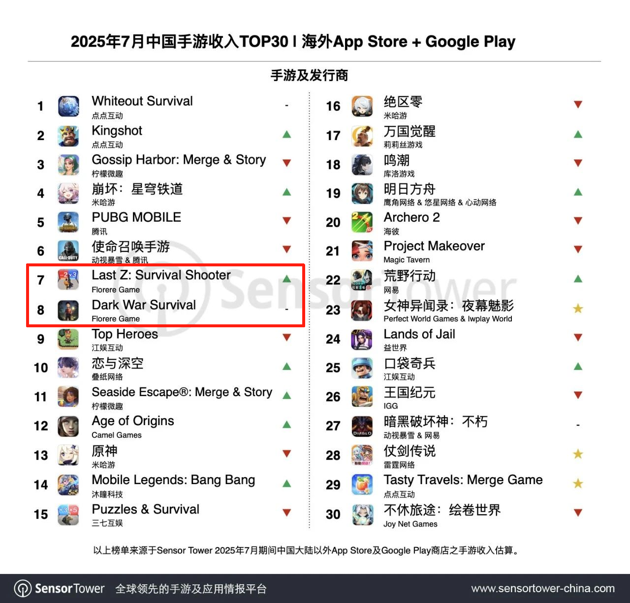 旗下末日题材4X策略手游《Last Z: Survival Shooter》在今年5月重磅上线iOS版本后,收入迎来爆发式增长,7月吸金环比飙升44%,首次冲进收入榜第7名。另一款末日4X策略游戏《Dark War Survival》收入保持稳定,目前Florere Game这两款力作都冲进了榜单TOP8。