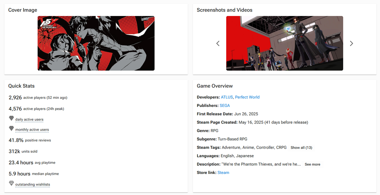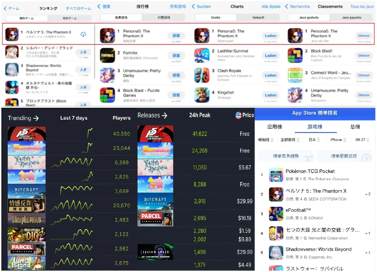 在PC游戏市场,《女神异闻录:夜幕魅影》的表现同样亮眼。