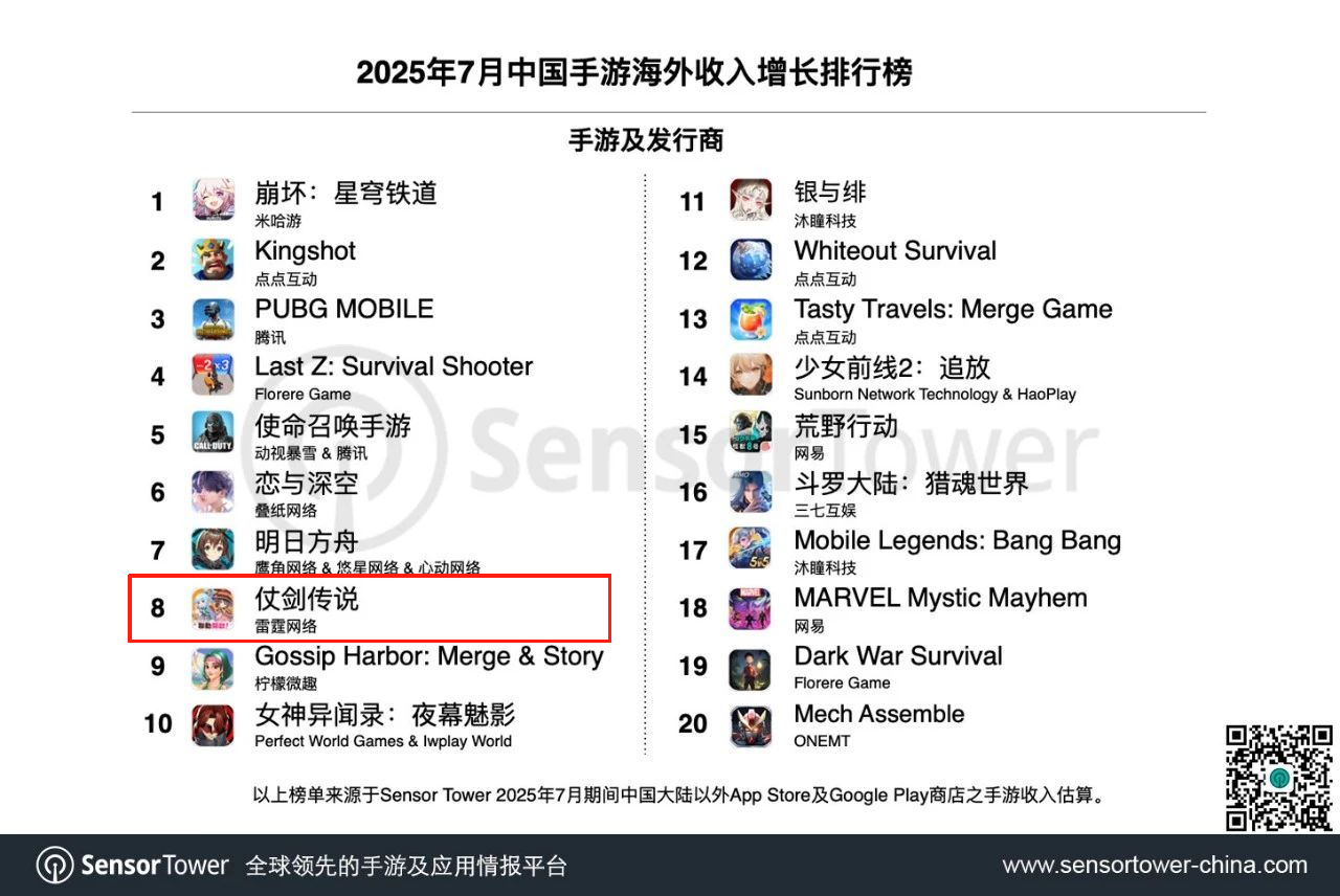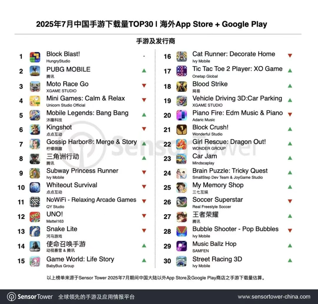 前几天(8月12日),SensorTower发布了2025年7月中国手游产品在海外市场收入排行TOP30(以下简称收入榜,仅统计应⽤商店IAP预估值,不包括⼴告变现收⼊)。