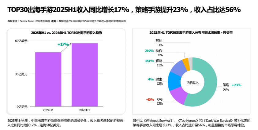 据Sensor Tower《2025年海外游戏市场洞察》报告显示,2025上半年,中国出海手游依旧保持强劲的增长势头,收入排名前30的游戏收入之和同比增长17%,达到58亿美元。