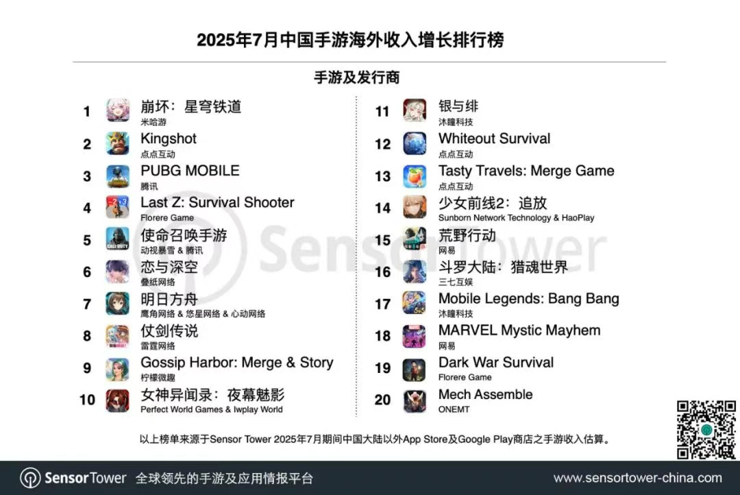 《崩坏:星穹铁道》7月海外收入激增290%,排名升至收入榜TOP4;《女神异闻录:夜幕魅影》国际服上线后,成功闯入收入榜TOP23。