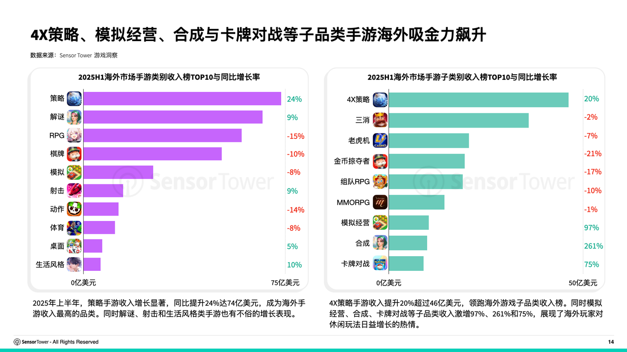 2025年上半年,策略手游收入增长显著,同比提升24%达74亿美元,成为海外手游收入最高的品类。