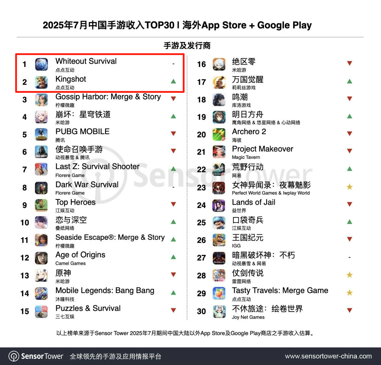 7月《Kingshot》收入环比再涨34%,与经典前作《Whiteout Survival》成功会师出海手游收入榜TOP2。截至2025年7月底,该游戏全球累计收入突破2亿美元,成为推动点点互动业绩增长的又一核心引擎。