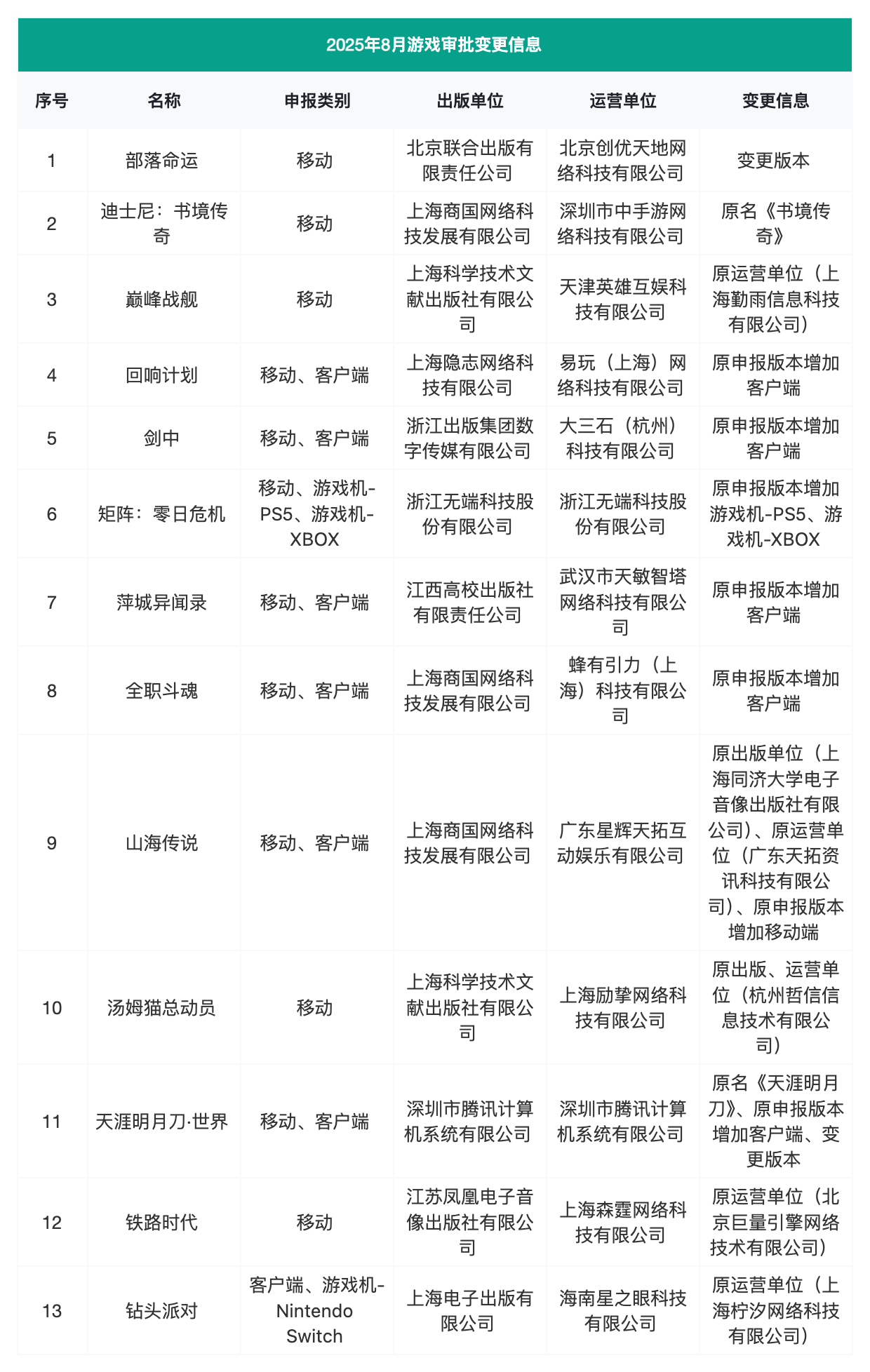 今天(8月25日),国家新闻出版署发布了《2025年8月份国产网络游戏审批信息》。