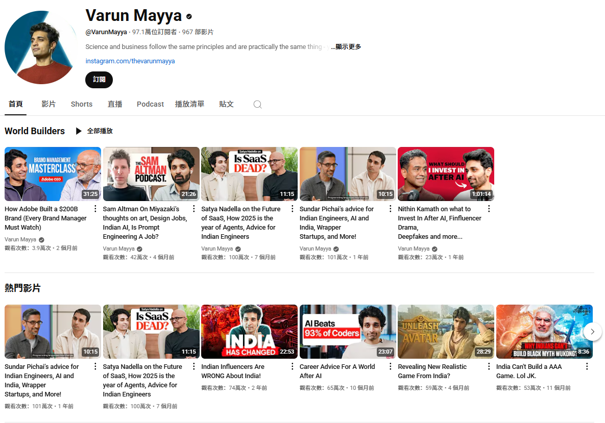 Mayya从2013年开始在油管发布视频,其内容聚焦科技和创业方面。在他的频道主要以科普内容和与科技圈知名人士的连线对话为主,这其中就包括Adobe的CEO尚塔努·纳拉延、OpenAI的首席执行官山姆·奥特曼等人。