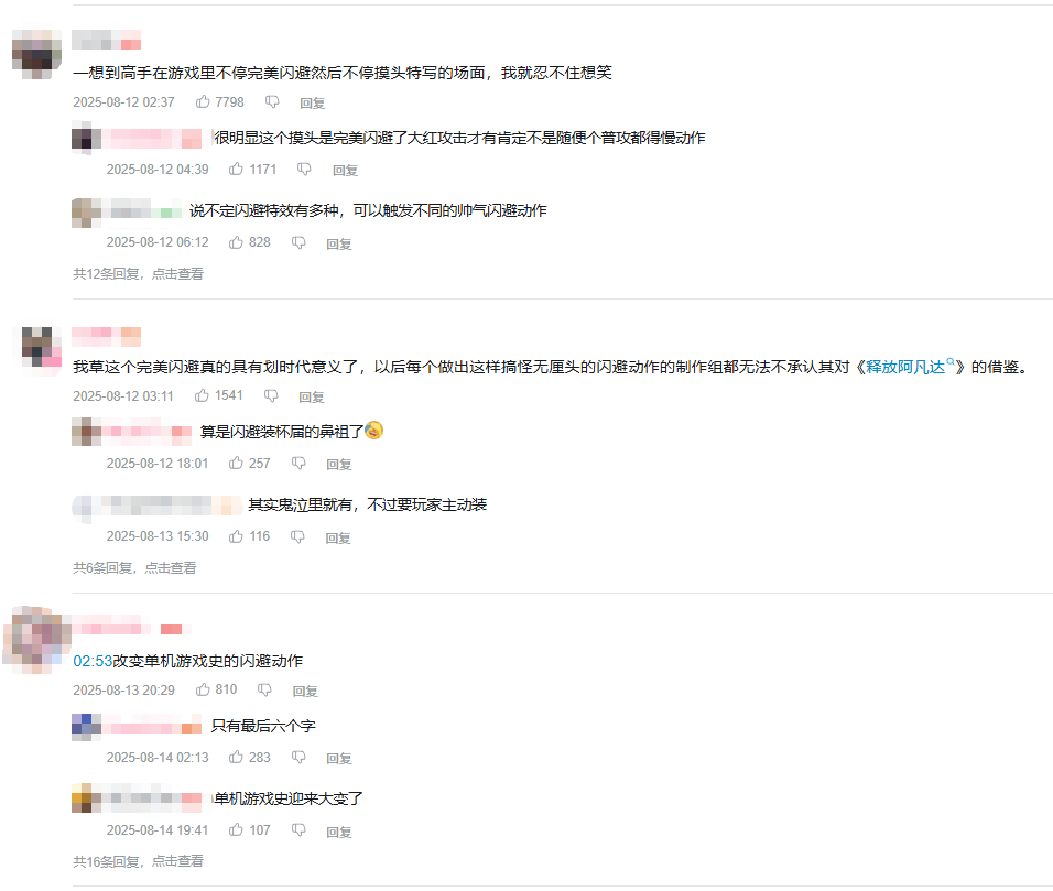 在评论区,高赞热评清一色是“改变游戏史的闪避动作”、“闪避太帅了”、“年度最佳动作设计预定”之类的字样,充满了戏谑与喜爱的双重意味,形成了一种网络迷因文化。
