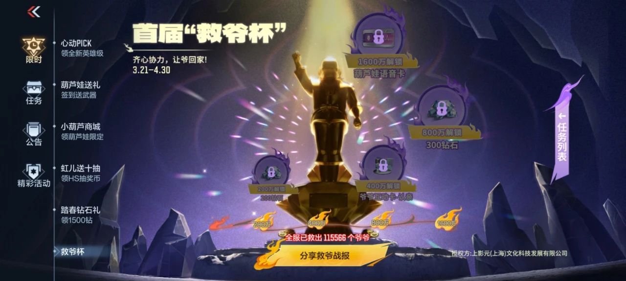 在与《葫芦娃》联动期间,CF手游不仅根据七个葫芦娃的不同能力,量身打造了七把拥有特殊效果的“葫芦娃武器”,让玩家能直接将葫芦兄弟“握在手中”战斗,同时还顺势发起“救爷杯”全服挑战,喊出“齐心协力让爷回家”,向玩家明确传递出官方下场整活的信号。