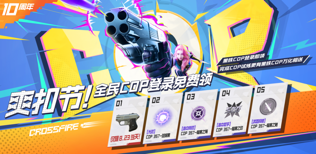 如同开篇所言,CF手游此次推出的“爽扣节”,既源自游戏内经典武器“黑铁COP”的谐音,又结合了游戏内”扣COP“的玩家梗。在游戏即将迎来十周年之际,官方选择将这把被誉为“平民神器”、承载着许多老玩家情怀的绝版手枪以登录领取的形式免费赠送。