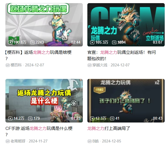 比如此前曾在体验服通过收藏自选卡获取的玩偶“龙腾之力”,由于并未在正式服上线,“返场龙腾之力”一度在玩家的主动传播下爆火出圈,甚至一度成为了各个社交平台评论区的热梗之一。