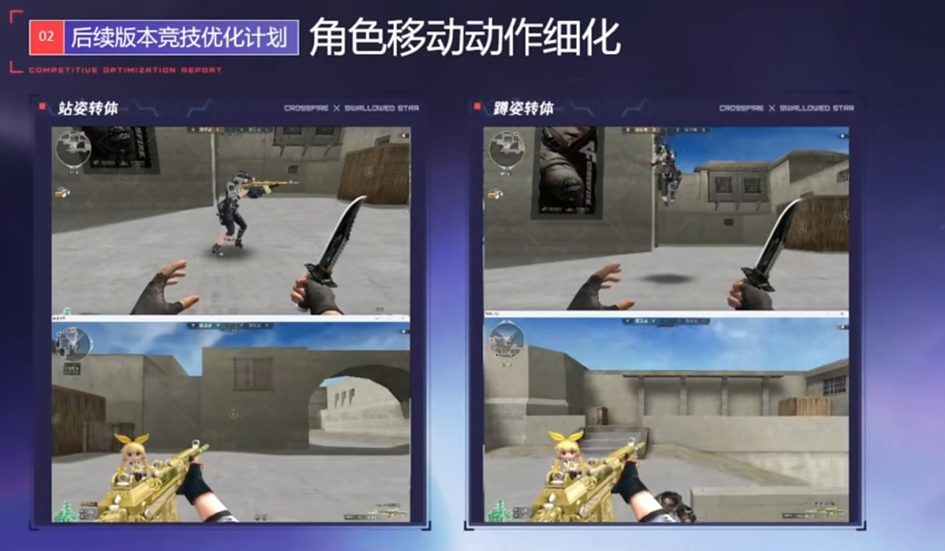 而在今年4月,CF手游也再次放出了包括关于网络双通道、角色移动动作细化、分模式按键自定义、敌方识别度增强等一系列功能优化的计划。其中,移动动作的细化调整了原有的站姿与蹲姿转体机制,使得局内模型可以单独转动上半身、抬头低头幅度更大,跳蹲状态从此也可同时实现。这一改动既提升了操作自由度,也让许多玩家热衷钻研的高端“身法”有了更多发挥空间。