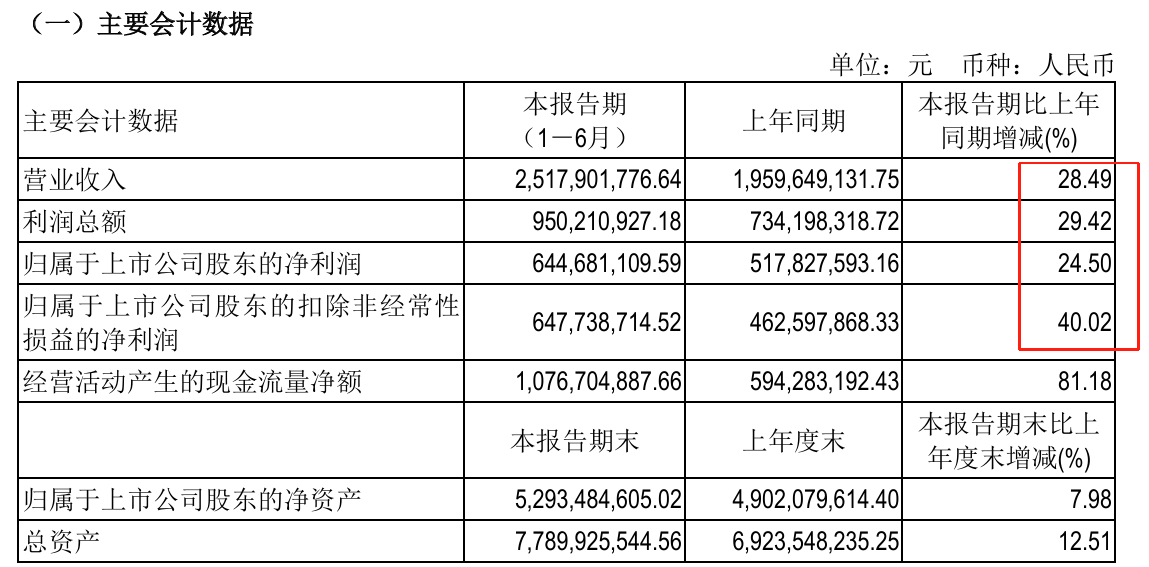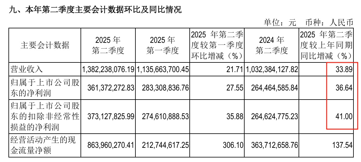 而整个上半年,公司实现总营收25.18亿元,同比增长28.49%;归母净利润6.45亿元,同比增长24.50%;扣非净利润6.48亿元,同比增长40.02%。