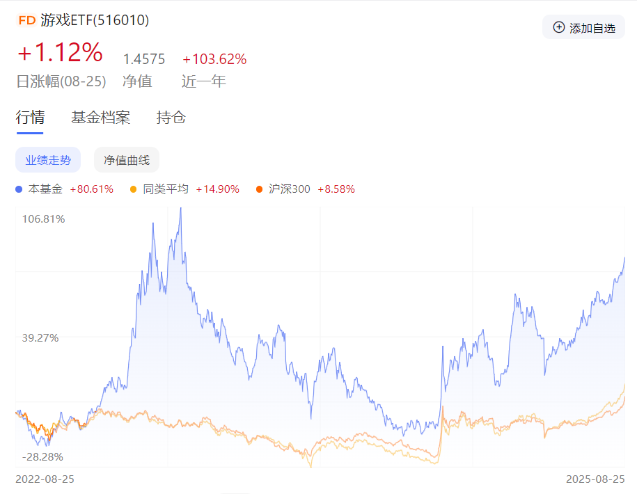 但就是这么个被长期看衰的“烫手山芋”,如今却反过来成为了A股市场带头领涨的明星:数据显示,反映游戏股集体走势的游戏ETF(516010)过去一年净值增长率高达103.62%,远超代表大盘的沪深300指数(34.32%),将此前一路走低的涨跌曲线硬生生拉成了「V」字型。