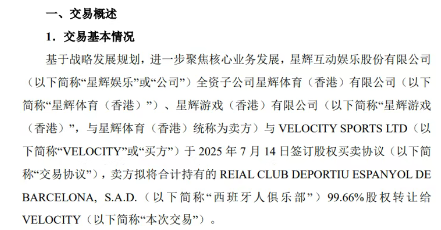 后续不久,星辉娱乐又宣布拟将西班牙人俱乐部99.66%的股权转让给 VELOCITY SPORTS LTD,对价为1.3亿欧元(约合10.88亿人民币)。据公告称,星辉娱乐将通过本次交易剥离足球业务回笼资金,以进一步将资源与精力集中在游戏研发与发行等核心业务当中。
