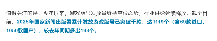而在带有行业“风向标”性质的游戏版号方面,截至目前,2025年国家新闻出版署累计发放的版号数量已经达到1119个(国产版号1050个,进口版号69个)。刚刚下发的8月份版号更是有多达173款产品获批,单月数量创2022年版号恢复下放以来的新高。
