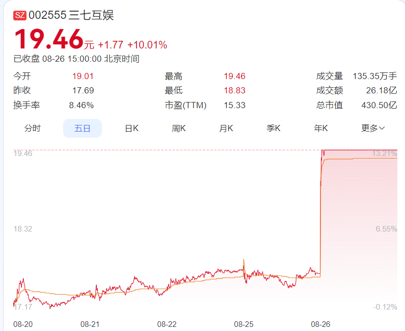 而作为A股游戏股“龙头”之一,三七互娱的涨幅虽然相对而言没有那么夸张,但在昨天2025半年报“新鲜出炉”之后,上半年净利润14亿元、同比增长10.72%的中期成绩单,也让这家华南大厂迅速收获了一个涨停版,股价达到2023年12月以来的新高。
