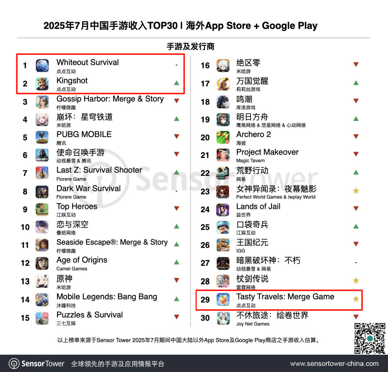 而助推世纪华通股价连翻三倍的最大“功臣”,自然是旗下点点互动的两个现象级爆款《无尽冬日》与《Kingshot》。在SensorTower近期发布的7月中国出海手游收入Top30当中,这两款SLG就力压《Gossip Harbor》《崩坏:星穹铁道》等一众产品,在榜单前二成功“会师”。加上首次挤进出海收入Top30的三消《Tasty Travel》,完成了「三游同框」的罕见场景。