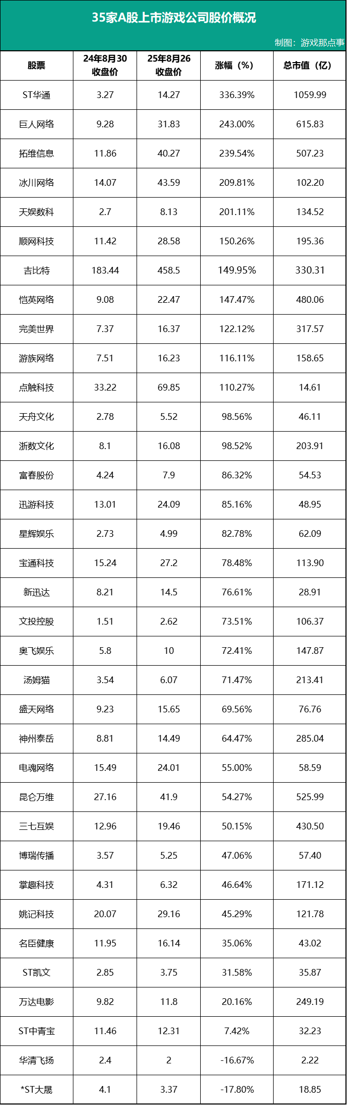 具体到相关个股,我们此次以最新收盘价(8月26日)为标准,对总共35家A股游戏上市公司的股价走势进行了统计。结果显示与2024年8月末的收盘价对比,其中有多达33家公司股价实现上涨,几乎称得上是“全线飘红”。