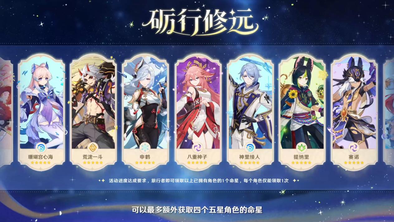 「砺行修远」全新活动即将上线,旅行者有机会自选免费五星角色命星。新版本会率先开放18位限定角色和7位常驻角色的命星获取,最多能在一年中通过「砺行修远」玩法,额外获取4个五星角色的命星。