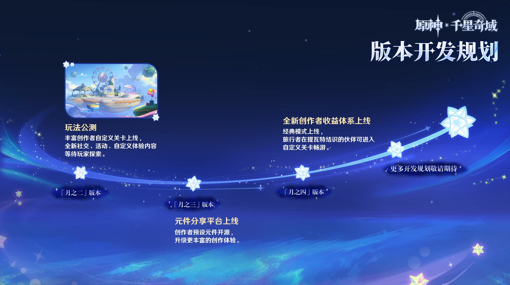 创作者支持方面,「原神·千星奇域」也提供了配套服务和全新收益体系,包括创作者学院、创作者论坛和技术顾问服务等,希望帮助玩家充分学习和应用编辑器。作为一项持续迭代的玩法系统,开发组同时也公布了未来版本的开发规划。