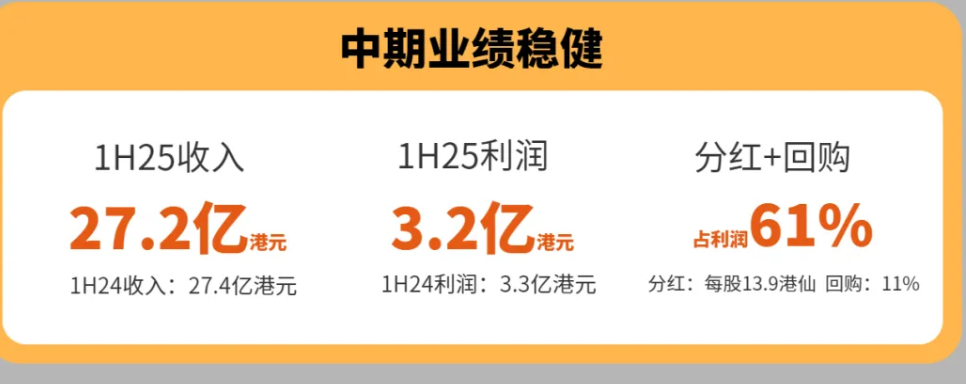 在刚发布不久的H1财报中,显示其上半年营收27.2亿港元(约合人民币24.96亿),净利润3.25亿元(约合人民币2.98亿),整体业绩震荡幅度极小。
