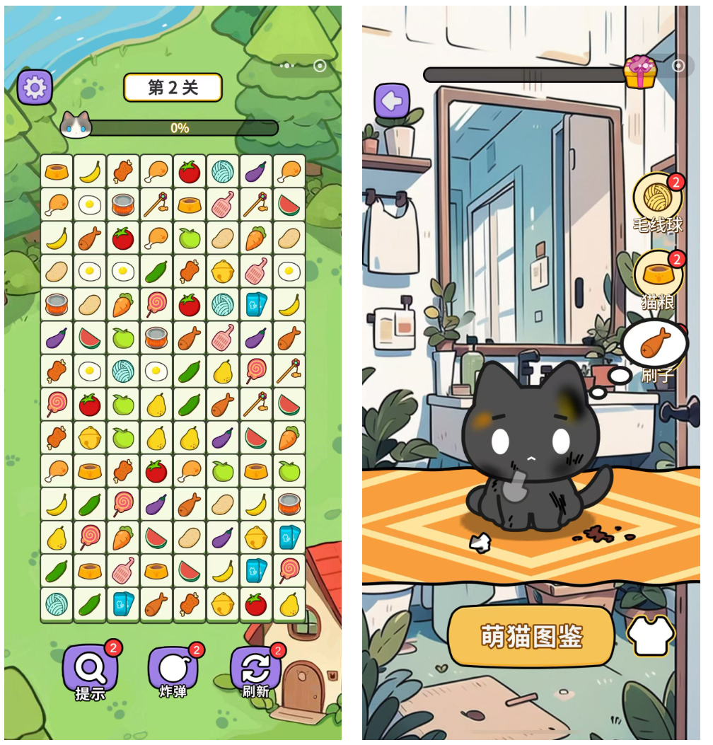 目前团队紧锣密鼓地同时推进四款小游戏,其中《喵了个消》已进入上线前的最后准备阶段。这是一款类连连看的二消产品,衍生玩法分别融合了收集、模拟经营与俄罗斯方块,依托广告获得收入。