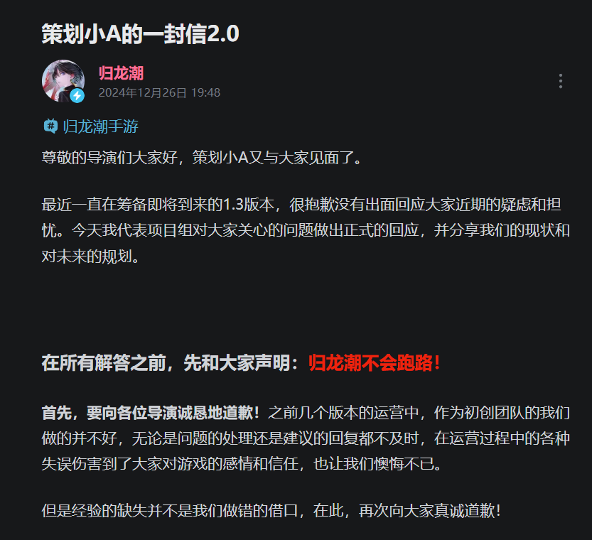 并在信中向玩家敞开地聊了聊《归龙潮》的现状,以及后续的规划。