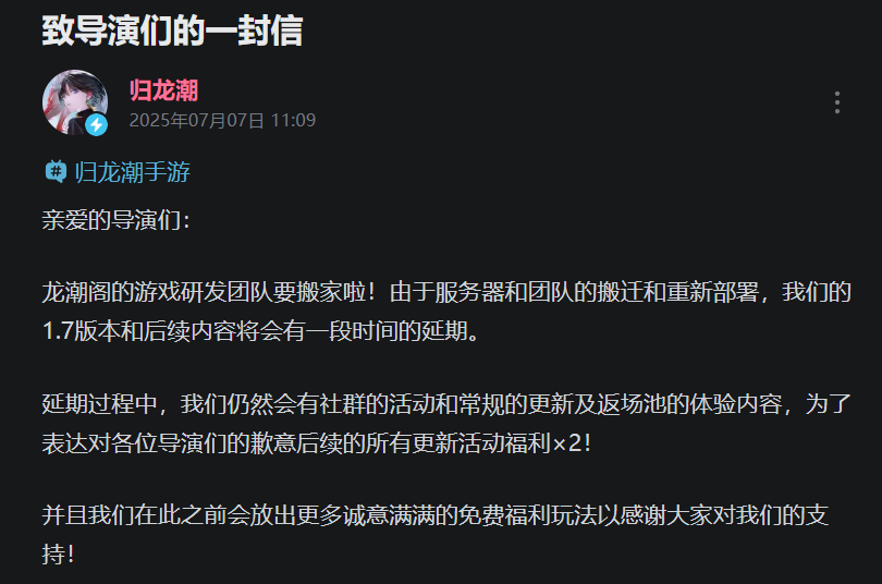 但好景不常,几个月后,让玩家不安的消息又来了。今年7月,《归龙潮》向玩家宣布研发团队即将搬家,由于服务器和团队的搬迁,后续的版本内容将会有一段时间的延期。