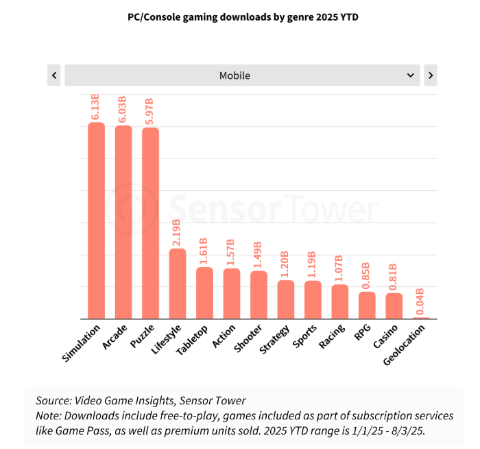 射击类游戏紧随其后,《漫威争锋》等产品的下载量达到1.89亿次;角色扮演类游戏势头同样强劲,在《怪物猎人:荒野》和《光与影:33号远征队》的推动下,下载量达到了1.31亿次。