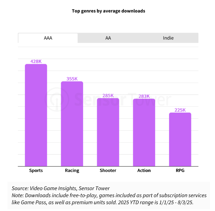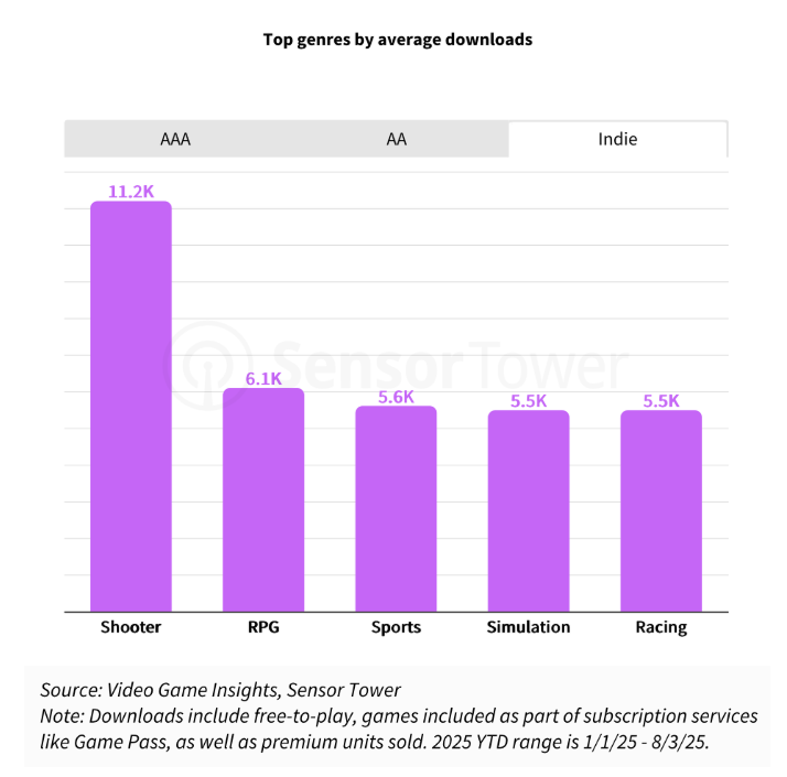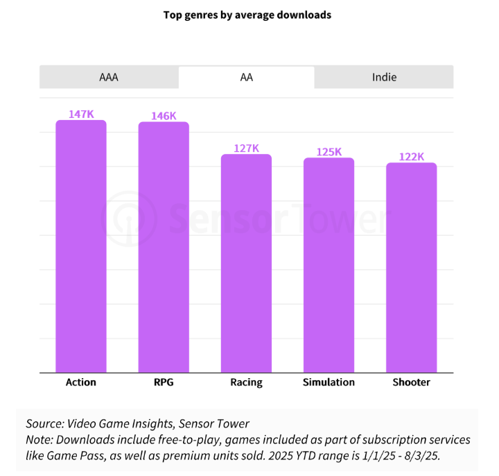 在中体量(AA)游戏中,动作类和角色扮演类平均下载量位居前列。不过,今年表现最好的是角色扮演类,包括《光与影:33号远征队》《天国:拯救 2》和《明末:渊虚之羽》。