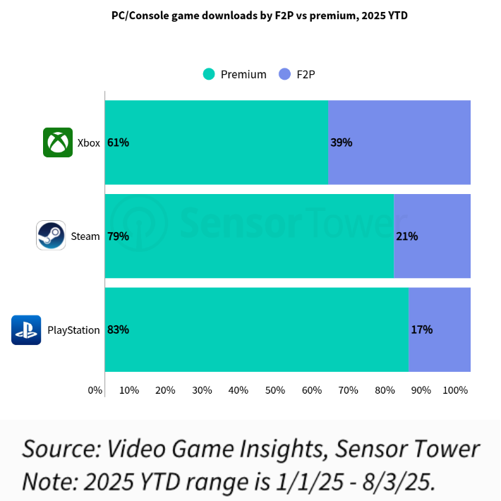 在所有PC/主机平台中,Xbox用户对F2P游戏的偏好最为明显,此类游戏下载量占总下载量的39%——不过这一趋势受多重因素影响,包括Game Pass、跨平台多人游戏以及行业向服务型模式整体推进等。
