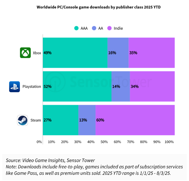 3A游戏在PlayStation和Xbox平台占据主导地位,下载量占比分别为52%和49%,这体现了两大主机平台对重磅系列作品和大型工作室发行游戏的侧重。相比之下,Steam平台的3A游戏下载量占比仅为27%。