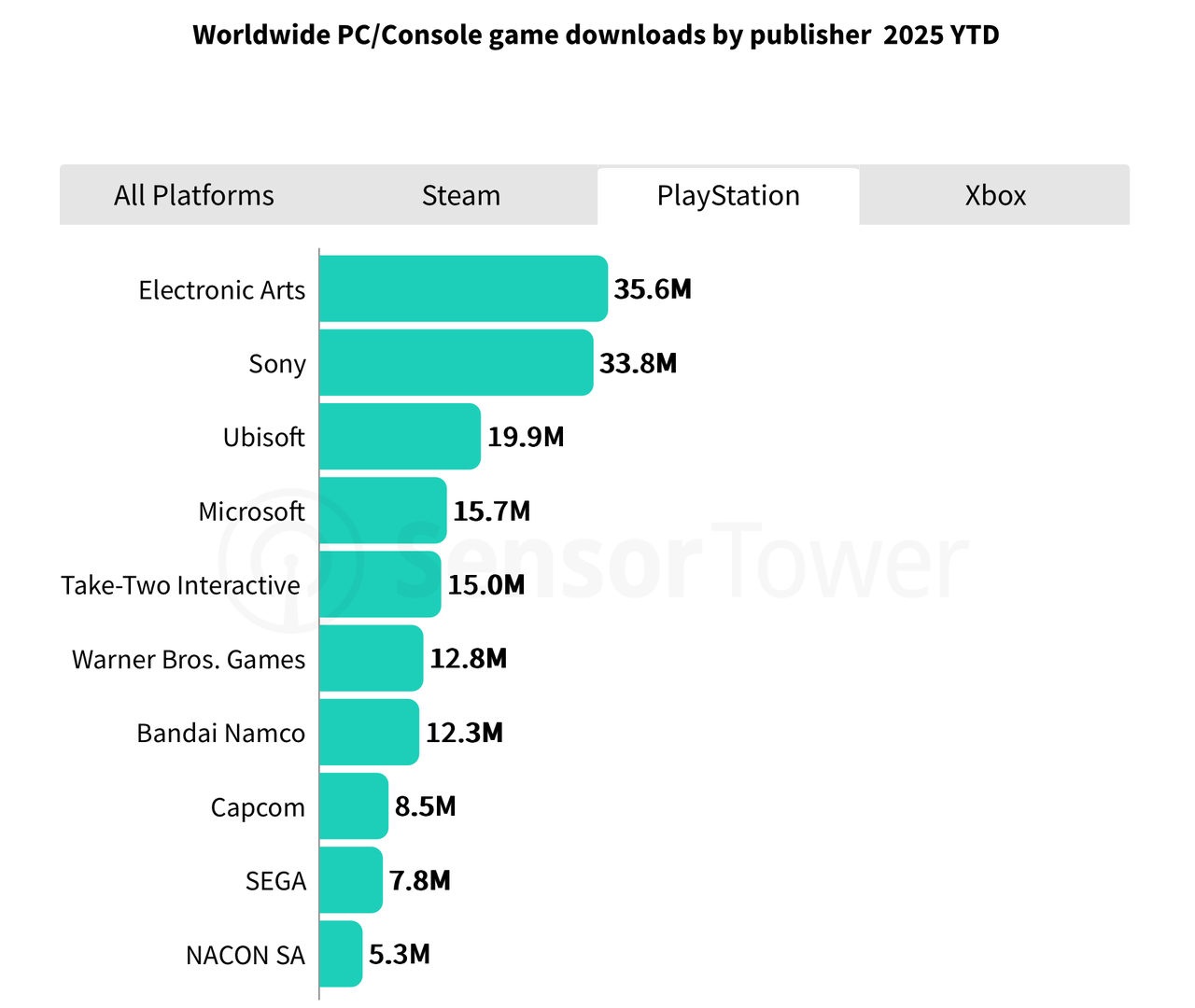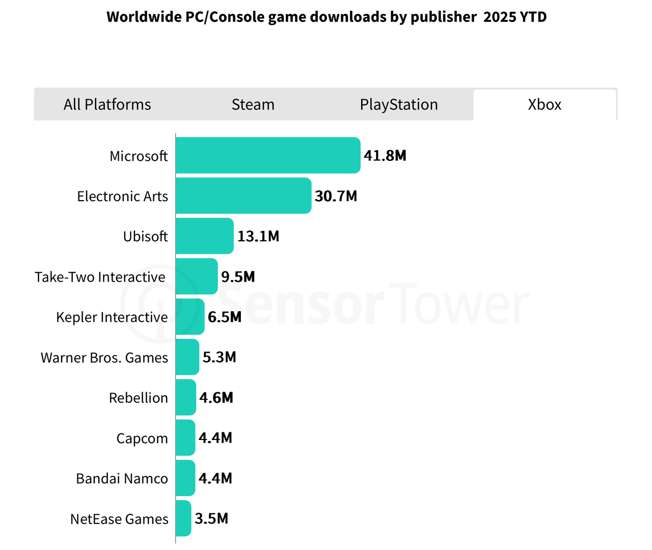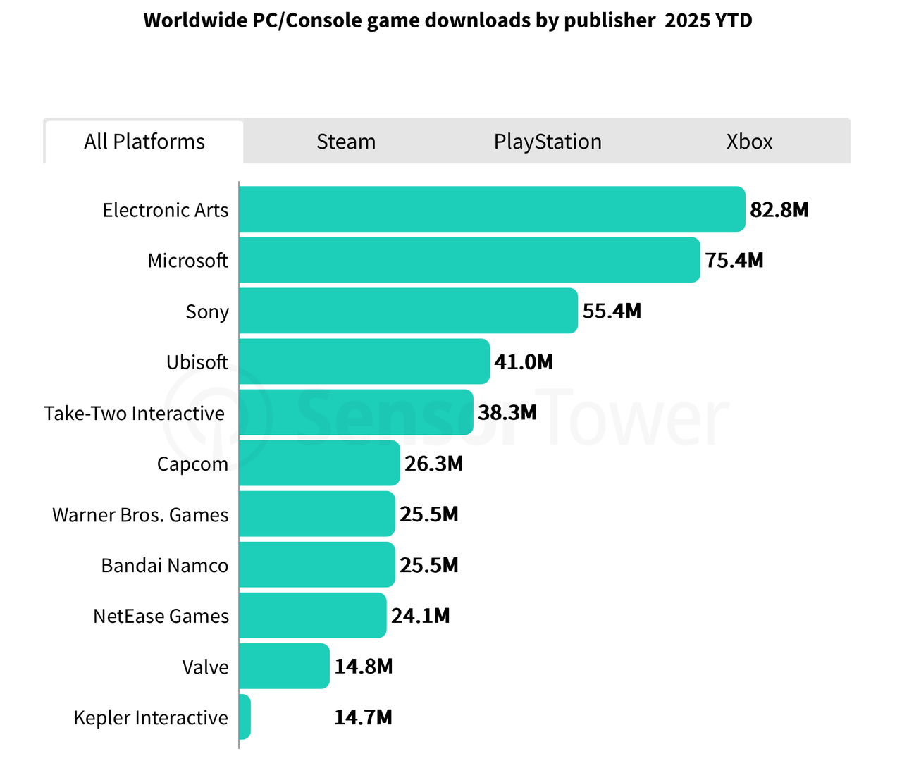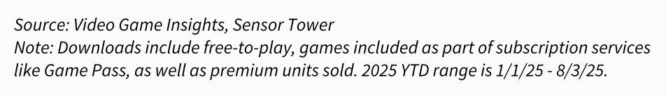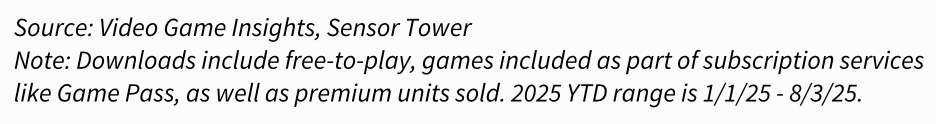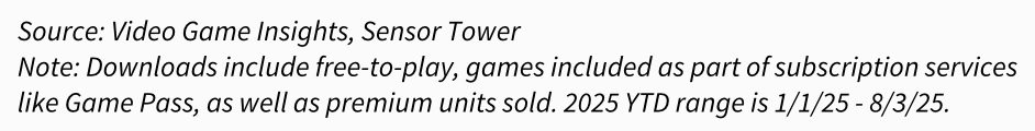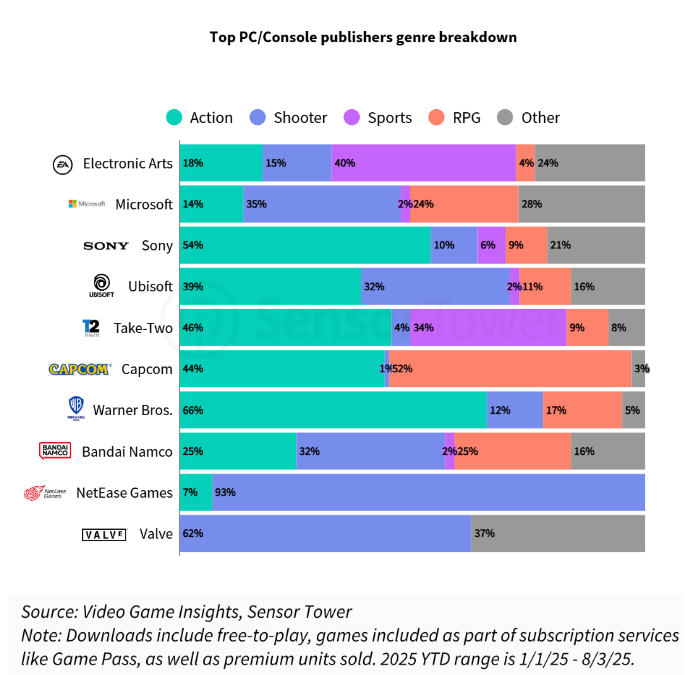 截至8月3日,EA是PC/主机游戏下载量最高的发行商,旗下游戏产品组合下载量达到8280万次;微软紧随其后,凭借强大的Xbox生态系统和Game Pass,下载量为7140万次;索尼则凭借旗下多元化工作室生态的内容支持,以5540万次下载量排名第三。