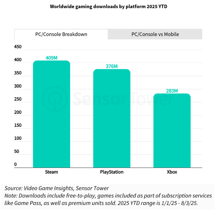 凭借庞大的游戏库和定期的促销活动,Steam在PC数字游戏发行领域的主导地位持续巩固。据SensorTower数据显示,从今年初到8月3日,Steam平台累计获得了4.09亿的下载量,领先于PlayStation和Xbox平台。